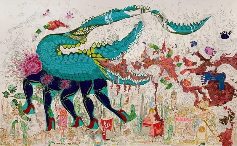 Through large-scale, colourful drawings, printmaking, sculpture, and short stories, artist and climate activist Isabel Rock imagines a new world order populated by mutant hybrid species – giant slugs, feral rats, colossal pigs, and multi-limbed crocodiles – who have inherited the ruins of human civilisation. Confronting pressing geopolitical questions – of capitalism, climate change, and repressive power structures – Isabel’s mischievous language of humour, drama and fanciful characters brings a lightness of touch that in no way belies the seriousness of her concerns.